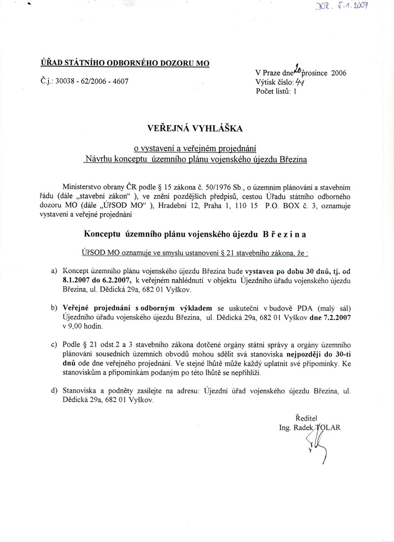 | | Koncept územního plánu voj. újezdu Březina | 5.1.2007 | | 9.2.2007 |