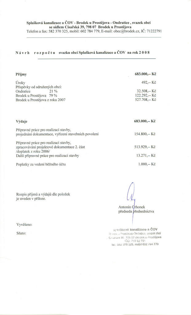 | 13. | Návrh rozpočtu svazku obcí Splašková kanalizace a ČOV na rok 2008 | 18.4.2008 | | 30.5.2008 |