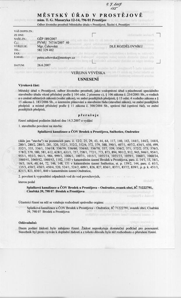 | | Splašková kanalizace - Usnesení o přerušení řízení | 3.8.2007 | | 23.9.2007 |
