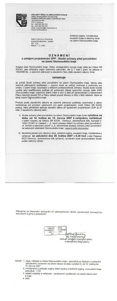 | | Oznámení o zahájení projednávání ÚPP-Studie ochrany před povodněmi na území olomouckého kraje | 14.5.2007 | | 27.6.2007 |
